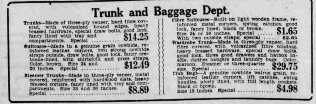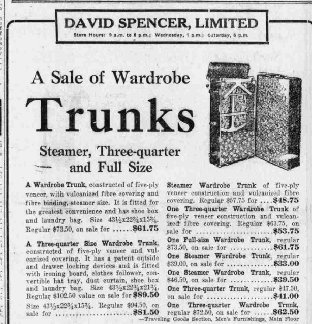 Where did Harold buy the trunk, and how much did it cost? Contemporary advertisements give some ideas. Most major department stores in Vancouver – sold wardrobe trunks. These were sold in the “Traveling Goods Section, Men’s Furnishings, Main Floor” at Spencer’s. By the description below, these seem to be Vancouver Trunk & Bag Ltd. products. The prices varied by type of trunk (and features inside), and the price seems to have gone down over the years.