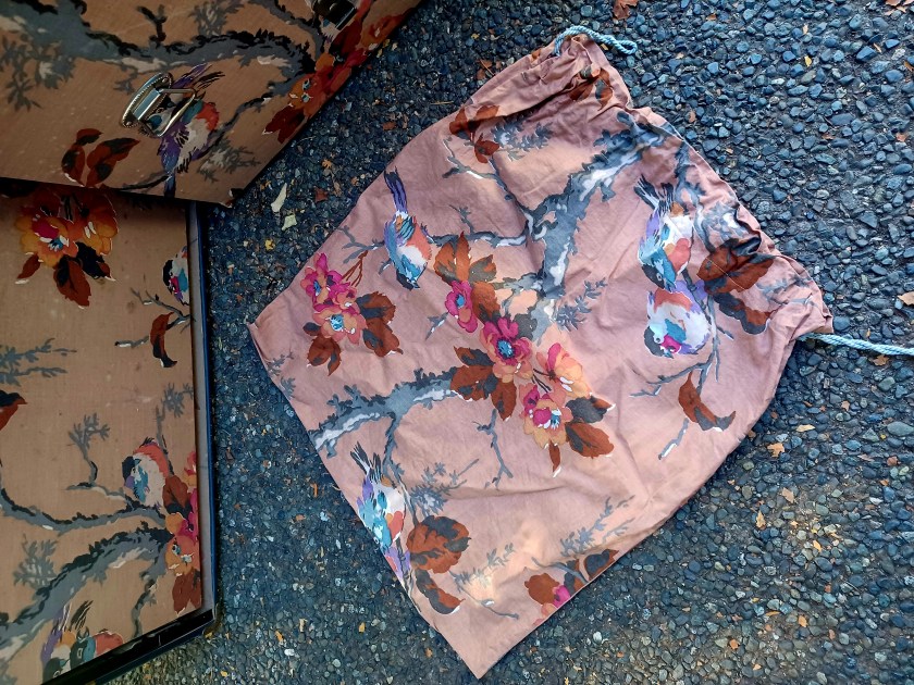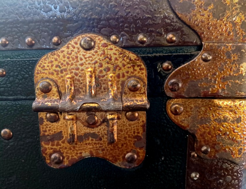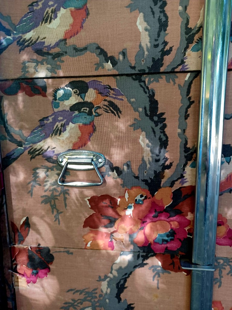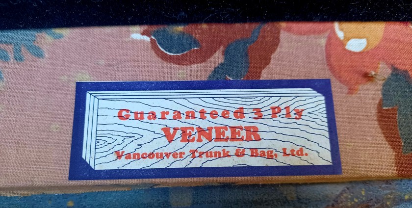 Here’s a description of the Lion Brand wardrobe trunk. This is a bit higher end version than Harold Monks’ trunk — “In its dainty cretonne* lined interior there are constant hangers for a dozen suits or dresses, a laundry bag, shoe box, an ironing board, an electric iron holder, hat box and removable hat form, all with a self locking draw bar which fits over the drawer fronts, and a roller curtain to keep the contents free from dust when the trunk is open.” (Vancouver Sun June 23 1928) *Cretonne is a type of upholstery material.
