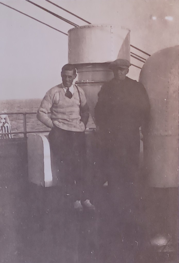 What kind of clothes would a 1920s traveller like Harold Monks be storing in his wardrobe trunk? Here’s Harold on deck on December 12 1928 in a white shirt, tie, V-neck argyle knit sweater. The guy next to him has a “flat cap”. Harold’s hair is “brylcreemed” – the brush and supplies would probably be kept in one of the drawers.