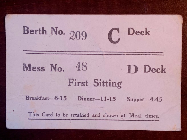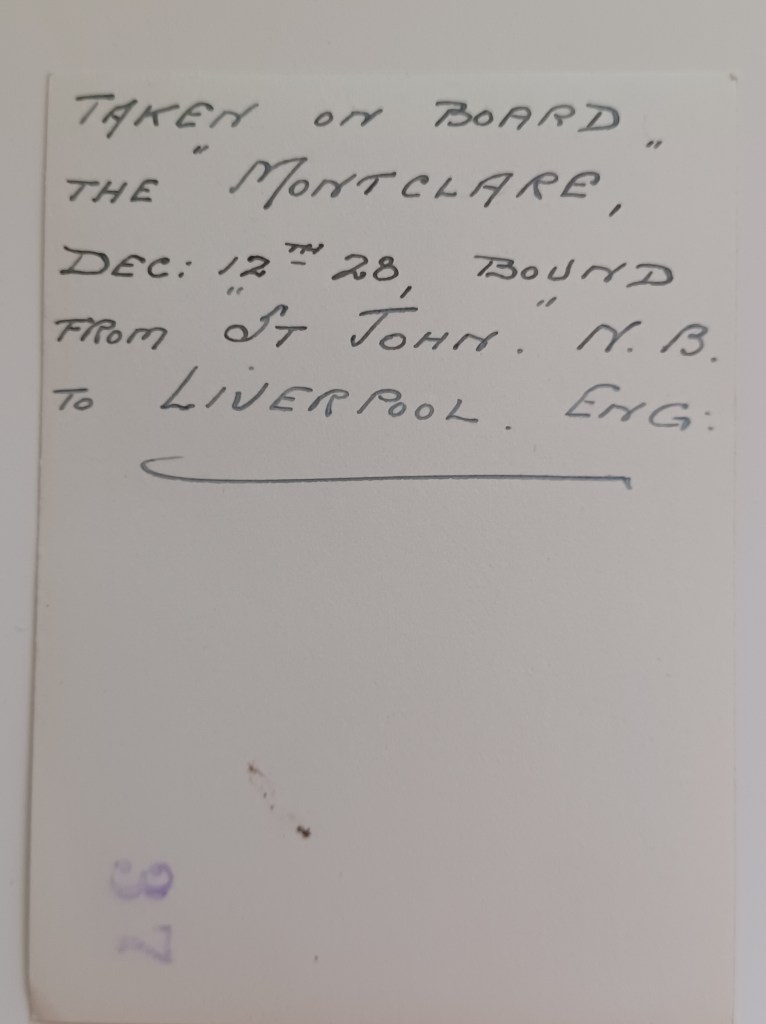 In December 1928, the trunk and its new owner Harold Monks left Vancouver by train for Saint John New Brunswick. They boarded the Canadian Pacific Steamship “Montclare”. Harold was travelling Third Class in a two-person berth. The room was interior, meaning facing the corridor and no outside windows, but in December weather, probably a good thing!