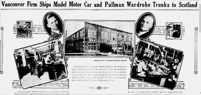 Vancouver Trunk & Bag was granted a certificate of incorporation in December 1920, value $75,000. The company was managed by Frederick Maclean Storey and Charles Brayne. In 1928, all stock in the company was held in Vancouver.