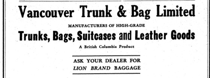 The Vancouver Daily Province May 10 1921 – Man Wanted – sewing machine operator on heavy machines. Apply Vancouver Trunk and Bag Ltd.