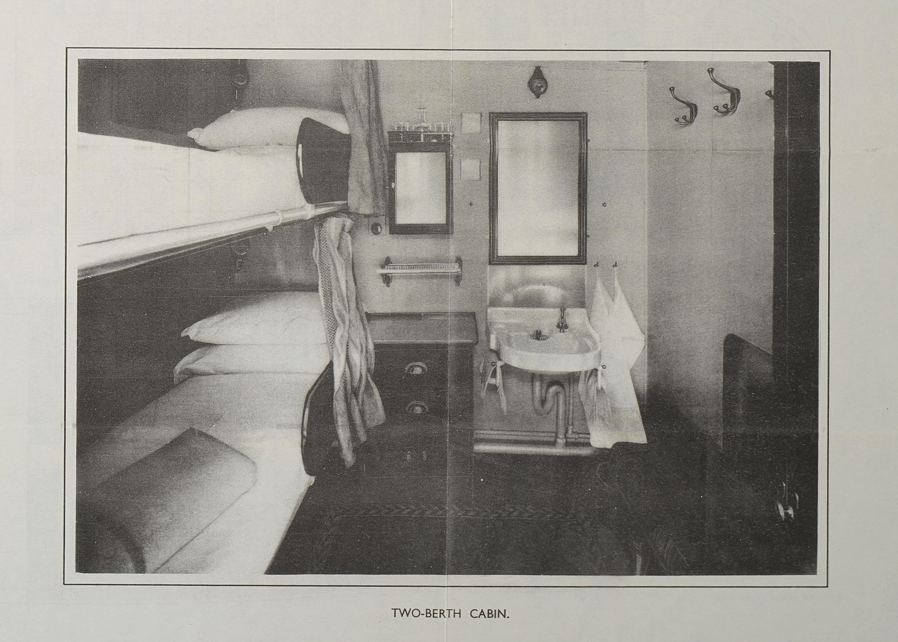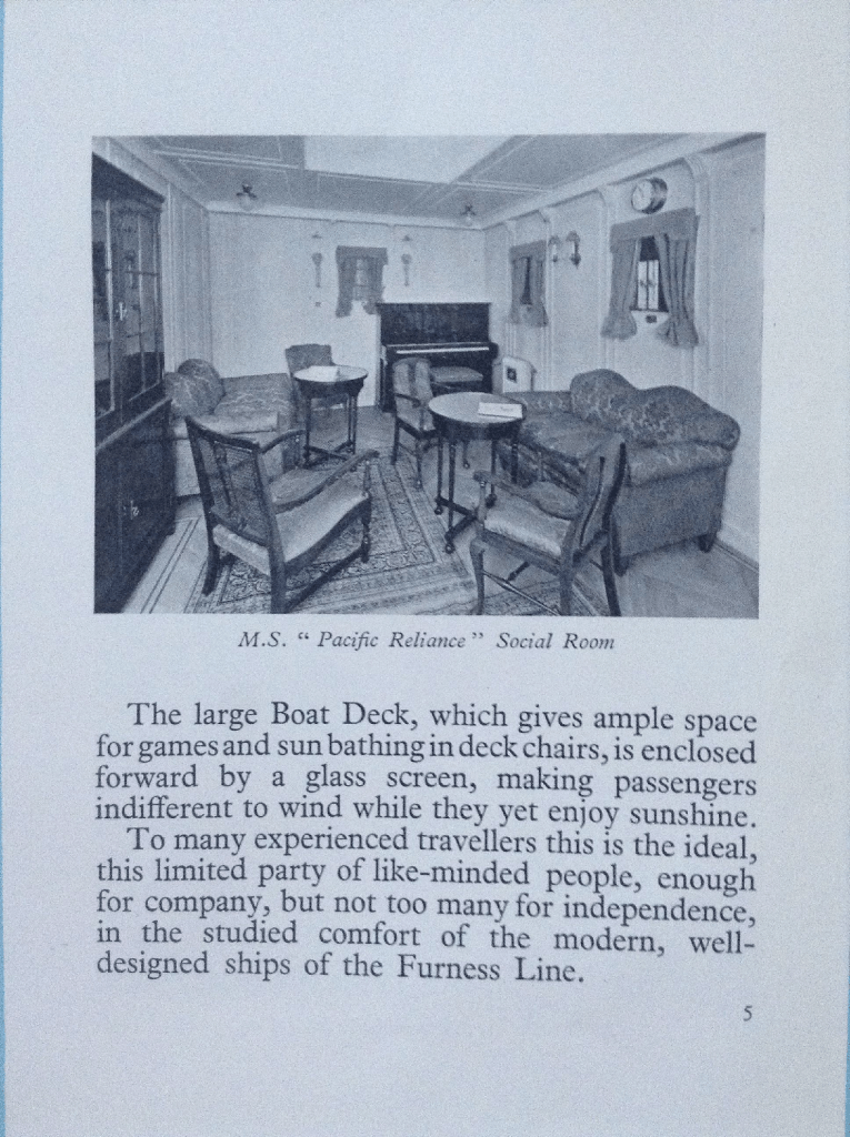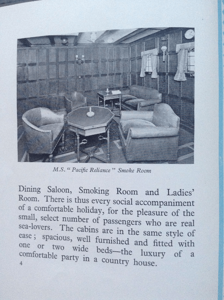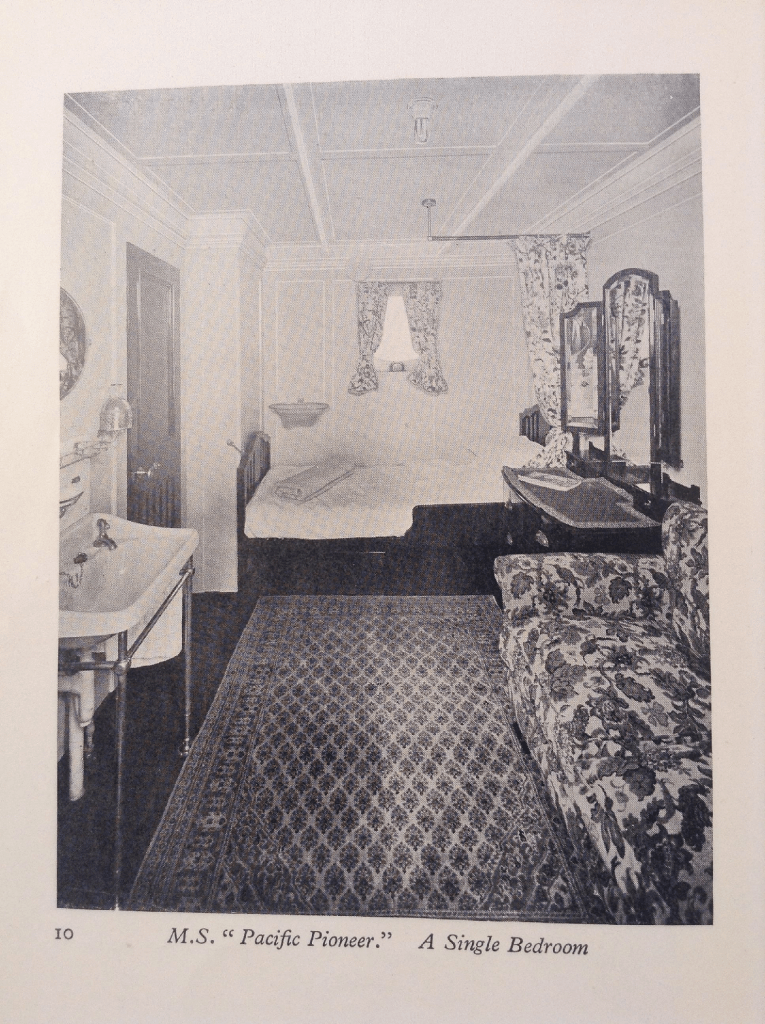 No berth or baggage room for the trunk this time – on the “Pacific Pioneer” the trunk enjoyed the nice surroundings of a bedroom with a carpet and a floral chesterfield. “Good accommodation for a limited number of first-class passengers on the bridge deck. Here they enjoy large rooms, placed amidships with direct lighting and ventilation.”