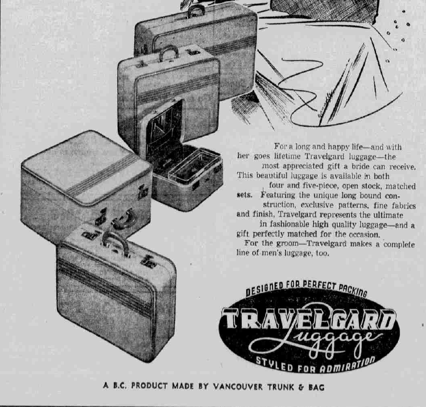 In 1949, Vancouver Trunk & Bag Limited employed 75 persons the year round and 90 at the peak. Fred Storey was still manager. “Mr Storey is proud of his products which are literally hand-made. Clear grained cedar from BC forests and top-grade plywood from Vancouver factories go into the light, sturdy travel cases, which carry the Travelgard and Skyway labels…There are dozens of whirring machines but the skilled hands of men and women are responsible for the beautiful work in linings, coverings and bindings.” (R.J. Moore, Vancouver Daily Province January 29 1949)