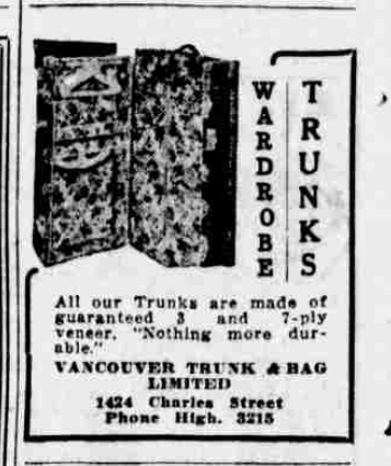 In April 1921, Vancouver Trunk and Bag Ltd was producing about 120 trunks. The company planned (with added employees hired in coming months) to produce between 300 and 400. “In addition to trunk making, all types of suitcases and club bags, varying from the cheaper karatol types to cowhides and pigskins, will be made.” (W.L. Dyer,Vancouver Sun April 17 1921)