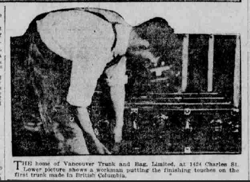 In April 1921, Vancouver Trunk & Bag Ltd. started operations with “a staff of 17 highly trained trunk and bag workers imported to Vancouver… within a short time a score or more of Vancouver men will be taken on and instructed in the work.” (W.L. Dyer, Vancouver Sun April 17 1921) A 1928 article mentions “fifty expert artisans of both sexes who find employment here.”