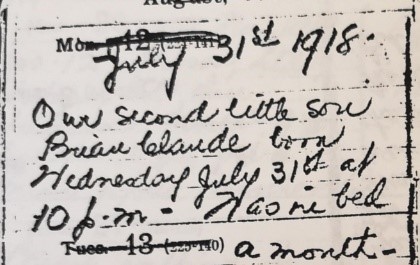 Over the next couple of years, Ethel Lytton’s diary shows she was busy raising the babies, taking music lessons and going on camping holidays to Shawnigan Lake. Ethel, like every new parent today, filled her photo album with snapshots of babies Gerald and Evelyn. When the children were 5 and almost 4, a new brother arrived. “Our second little son Brian Claude born Wednesday July 31st [1918] at 10 p.m.” This time Ethel’s pregnancy and the new baby were not as easy. Was in bed a month. Bad leg. Miss Cossar with me for two months. Then Miss Falkner for a month. Brian very wakeful baby. I had to take tonic and sleeping powders after the nurse left.” Brian weighed 12 lb in Fall 1918, “Not as fat as other babies.” But Ethel later noted that “Brian walking at sixteen months, very strong and fat.”