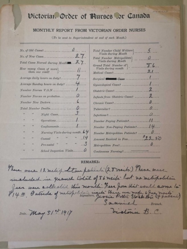 By early 1917, a branch of the Victorian Order of Nurses (V.O.N) had been established in Saanich. The goal was now to get members (who would pay a nominal fee of $1 per year) and to run public education events. In Spring 1917, the V.O.N. decided “to hold meetings in the afternoons in the different schools of the district, to acquaint the mothers with the work of the nurse.” On April 27 1917, Nurse Stockton met with mothers at Tolmie School and on May 1 1917 she gave a short talk at the Craigflower School Parent-Teachers Association.