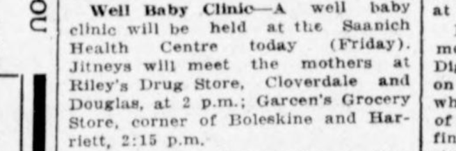 Following from the success of the baby contest / clinic in 1917 and 1918, Saanich V.O.N. nurses began a formal clinic for mothers and babies. On October 7 1921, the first “Well Baby Clinic” was held in Saanich. Jitneys picked up mothers from local grocery stores and brought them to the Health Centre in Royal Oak. Clinics were held every second Friday afternoon commencing at 2.30 p.m. By 1922-1923, there were 348 babies were registered. Clinics were also established at Cloverdale and Tolmie School. The examining physician was Dr. Walter Bapty, who in 1914 had stated: “Medical inspection should commence at infancy and not merely after the child enters the school.”