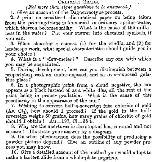 It’s highly probable that Chris trained in photography with his uncle Frederick Hollyer. By the 1880s, Chris was proficient enough to attempt professional qualifications. The City and Guilds of London Institute for the Advancement of Technical Education ran annual technological examinations in Photography. Chris Hollyer took the examinations on Wednesday evening, May 20 1885. The examination results were published in the August 14 1885 issue of The Photographic News, a Weekly Report of the Process of Photography. First Class Ordinary Pass Grade – C.W. Hollyer. Hollyer was one of only 38 successful students. This was a tough examination. In May 1884, the year before Hollyer took his examinations, 61 candidates entered the examination and 37 passed. (The Photographic News August 8 1884). These are the questions from the City and Guilds Photography examination of May 20 1885. (Published in Photographic News May 22 1885)