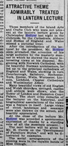 On February 12 1920, Chris Hollyer gave a slideshow on the cathedrals of England at the Island Arts and Crafts Society: “Those members of the Island Arts and Crafts Club who were not present at the lantern lecture given by Christopher Hollyer last night in the clubroom on the Cathedrals, Abbeys and Homes of England and Wales missed a pictorial treat. After the introduction of the lecturer by the president, Mr. Hollyer soon attracted the attention of his large audience by the masterly manner in which he showed the many interesting views at his disposal. The short crisp remarks of the lecturer on the historical and biographical associations of the views was a feature in itself….Large views of clouds, landscape and seascape were also thrown on the screen and heartily appreciated. At the close of the lecture, Mr. Hollyer was accorded a spontaneous expression of thanks by a standing vote of all of the members present.”