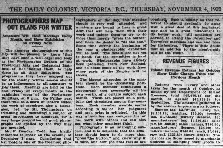 “A photographic society for Victoria?” There surely must be a sufficient number of people in this town, who are interested in photography, to make a success of such a venture, and many people have already spoken to me on the subject, and assured me that if once the idea was properly started, a strong feature could be made of it. I trust that this may be so, as I know from my own experience that a good photographic society is of great benefit to all who take an interest in photography. The idea of such an organization is to stimulate an intelligent appreciation of photography and to bring those who are interested in the subject together for the purposes of mutual help and companionship.”