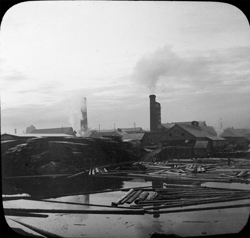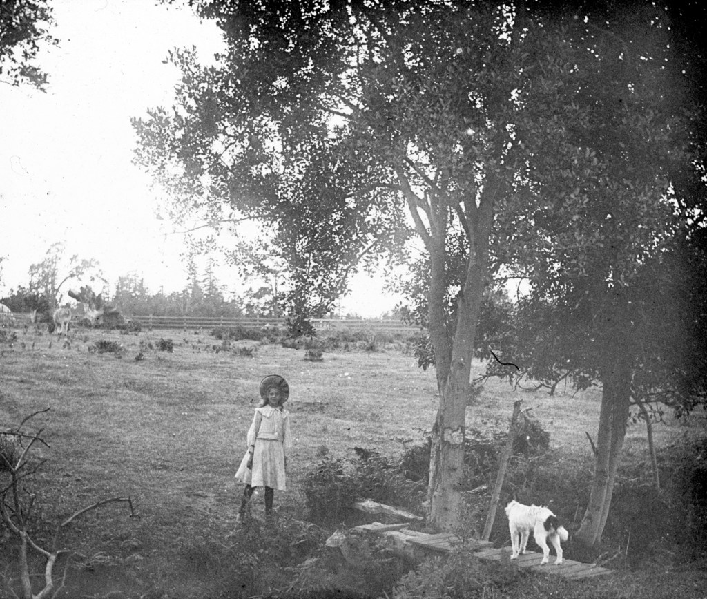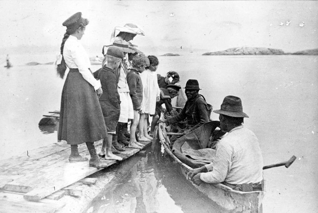 In this photograph, an old woman walks on a wooden sidewalk past a picket fence, showing a distinct period of time when the Songhees people were living in Victoria West. At the time Hollyer took this photo, the Songhees Nation was living on a reserve at Songhees Point in Victoria West, which was about to be taken over by the government and subdivided for housing. In 1911, the Songhees moved to a new reserve on the other side of Esquimalt. There is another image in Hollyer’s slides showing local children visiting two Songhees men in a canoe.