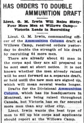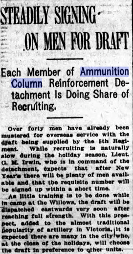 My grandpa Harold Monks enlisted with an artillery draft to the 4th Section of the Divisional Ammunition Column and left Victoria on May 22 1917. I was curious about what the Divisional Ammunition Column’s recruiting practices were – how it began recruiting and how Victoria’s morning paper, The Daily Colonist, reported on the D.A.C.’s recruiting. I wondered if Harold and his cohorts would have been influenced by the news items.