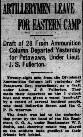 On Monday May 21, orders were received authorizing the departure of a draft. Six of the 8 men who had enlisted that day got lucky — they left the very next day. Two others had to wait until July to leave. “a sufficient number of men will be left here to continue an active recruiting campaign … as the Divisional Ammunition Column is still under orders to supply drafts at intervals for overseas service.” (‘Artillery will go to Petawawa Camp’ May 18 1917)