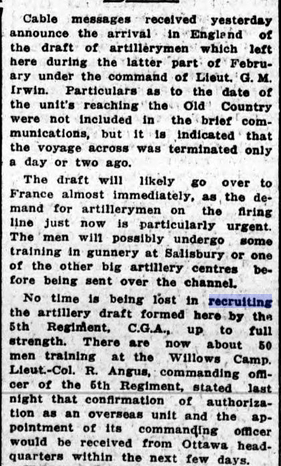 The best type of men must have heeded the call – by mid February, Irwin’s draft was awaiting departure (‘Artillery drafts leaving very soon’ February 18 1917) They would go direct to England “on account of the urgent need for artillery men to take part in the spring drive.” The draft arrived in England in mid March (‘Artillery Draft Arrives in England’ March 22 1917). With another comment about “demand for artillerymen on the firing line just now is particularly urgent,” the paper reported: “No time is being lost in recruiting the artillery draft formed here up to full strength.”