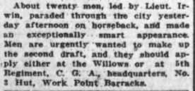 On January 2 1917, the paper reported ‘All Units Prepare to Launch Campaign’ – only about 20 more men were needed before the D.A.C. draft could look forward to the receipt of marching orders — it was not to be. On February 1 1917, the paper reported that Lieut. Irwin had received orders to double the number of men: “Lieut. Irwin wants the best type of men to fill up his corps and applicants should report to Willows Camp.”
