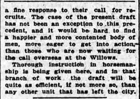 The article expanded on the “thorough instruction in horsemanship” being given at Willows Camp (possibly a selling point?) and noted that “it would be hard to find a happier and more contented body of men, more eager to get into action than those who are now waiting for the call overseas at the Willows.”