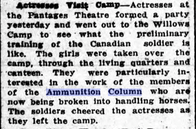 On May 3 1917, a small news item appeared in the paper – ‘Actresses visit Camp’. Actresses from the Pantages Theatre visited the Willows camp – “They were particularly interested in the work of the members of the Ammunition Column who are now being broken into handling horses.” Perhaps this item may have caught the attention of the otherwise desk- or factory- bound man – actresses clearly liked guys with horses!