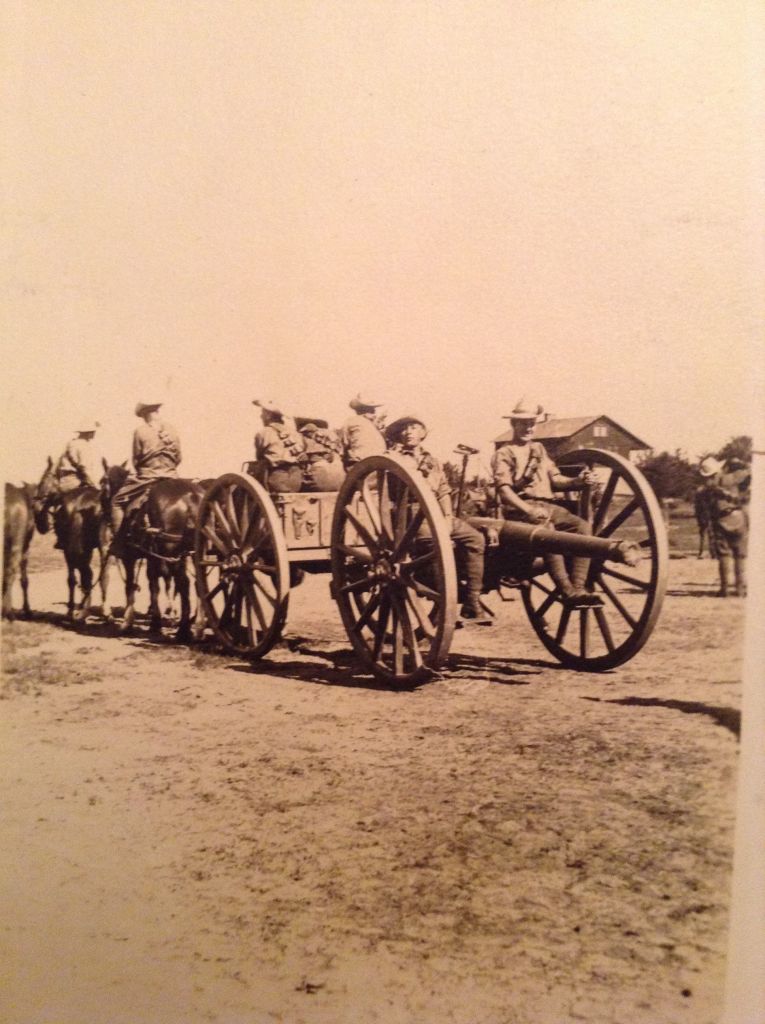 Horses pull an artillery wagon – desk-bound students and clerks needed to learn how to ride horses! Snapshot from Harold Monks’ album.