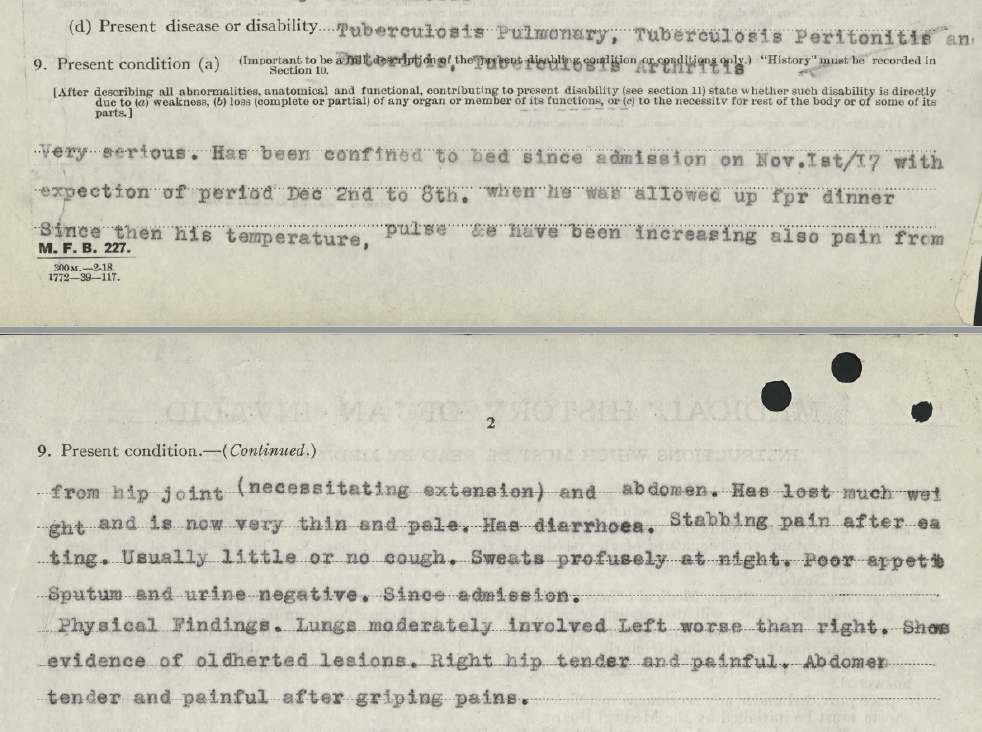 Two months later, Burdie went before the Medical Board. The Board’s report, dated May 4 1918, concluded that his illness had been contracted in March 1916 while on military service (meaning it was their responsibility to care for him) Here is the selection from his medical report: