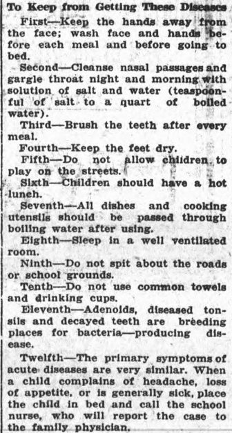Dr. Vye is preparing a short table of instructions which the board will have printed and a copy placed in the front of every child’s text book, so that pupils and parents may know what is meant by germs and how to prevent them.