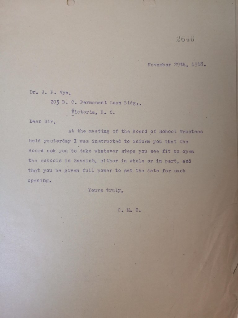 On Wednesday November 27 1918, the Saanich School Board gave Dr. Vye authority for opening schools: “At the meeting of the board of school trustees held yesterday I was instructed to inform you that the Board ask you to take whatever steps you see fit to open the schools in Saanich, either in whole or in part, and that you be given full power to set the date for such opening.” Vye did nothing for the present. The Daily Colonist December 1 1918 reported: “With the removal during the past week of the ban against meetings in Saanich, all the churches will be open today. There is to be no reopening of the Saanich schools for the present. The matter was left to the complete discretion of Medical Health Officer Dr. Vye by the school board, and he has decided that the time has not yet come for the pupils to return to their studies.” (It was just as well. Victoria Schools opened on December 2 and closed again on December 10, reportedly due to “flu” cases)