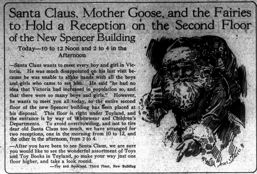 In the meantime, however, Saanich school children were free to go into downtown Victoria. Pierre and Yvonne Malon went to the moving picture houses, the public library, watched the Santa Claus Parade and visited Toyland at Spencer’s Department Store, where Santa was disappointed because he was unable to shake hands with all the boys and girls who had come to see him.