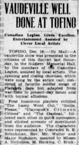 On January 23 1932, the Clayoquot Sound Branch of the Legion held its annual vaudeville show, a musical revue and pantomime, ‘Sleeping Beauty’. R.E. Brinckman produced and directed, and the cast included Katie Hacking and her fellow school teacher Eileen Montgomery (who later danced the Irish jig in an entr’acte of ‘The King of the Cannibal Isles’).