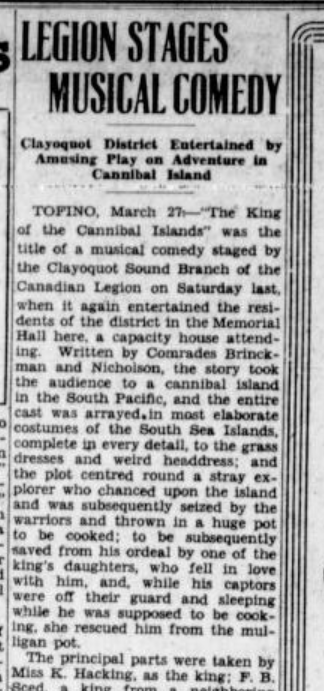These shows were a good way to get through the long wet winter months, Katie told oral history interviewer Bob Bossin (BC Archives, Tofino-Clayoquot Oral History Collection). When she was interviewed in 1979, Katie strongly recalled one play in particular: ‘The King of the Cannibal Isles.’ The show was performed on Saturday March 26 1932 at the Memorial Hall. “The story took the audience to a cannibal island in the South Pacific and the entire cast was arrayed in most elaborate costumes of the South Sea Islands, complete in every detail to the grass dresses and weird headdresses.” (Legion Stages Musical Comedy, The Daily Colonist March 27 1932) Katie played “The King” who ordered a stray explorer to be cooked!