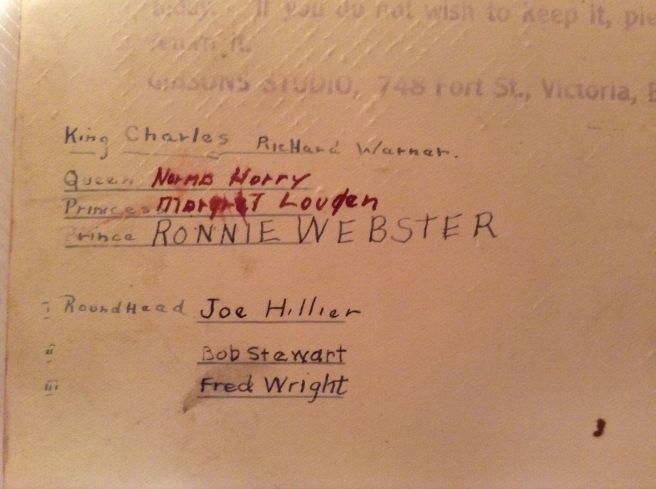 Dick Warner acted in at least two other school productions. On Friday evening, April 23 1937 he was part of an “exceptionally entertaining concert” at Victoria West School. “Carried out with minimum of waits between numbers, the varied items on the programme, splendidly staged with colorful costumes and suitable lighting effects, were much enjoyed by all. The new school curtains were in use and their value and attractiveness were subject of much comment during the evening.” Dick performed in a sketch with Mrs. J. “Ma” Kennedy, Joe Hillier, Paul Stromkins, John Banister and Gordie White, supported by a chorus, dancers and a mouth-organ band! He played another regal character as “King Charles” in this English Civil War themed production at Victoria West School. (I’ve not been able to find any specific mentions of the production in newspaper reviews, but it looks to be the mid 1930s.)