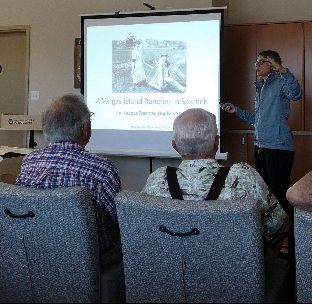 In early 2019, I shared some of Hopkins’ story when I guest curated the Vargas Island Ranchers at Home and at War exhibit with the Tofino Clayoquot Heritage Museum. A few months later, Saanich Archives invited me to share the Saanich part of the story. In May 2019, I gave an illustrated presentation “A Vargas Island Rancher in Saanich” at the Greater Victoria Public Library, Saanich Centennial Branch. Fred’s original letters, family photos, land records and archives documents brought to life this often amusing and exasperating parallel story.