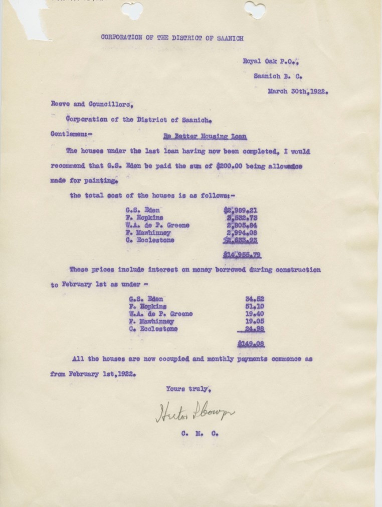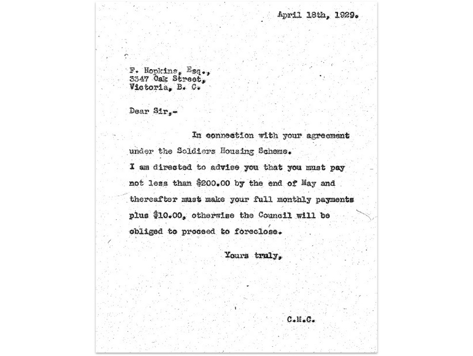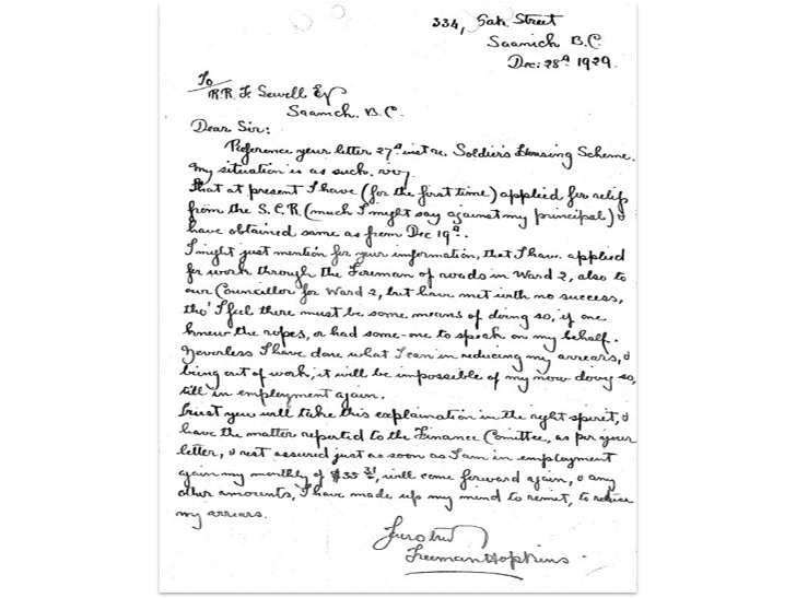 Hopkins left financial issues unresolved with Dawley and went overseas to war service as an engineer in the Middle East. His wife was left to continue the financial discussions with Dawley. When Hopkins returned from overseas, he settled in back in Saanich, where in 1921 he was a recipient of a Saanich Soldier’s Home. But in 1929, he started exchanging letters with the Municipality of Saanich — about unpaid house mortgage payments.